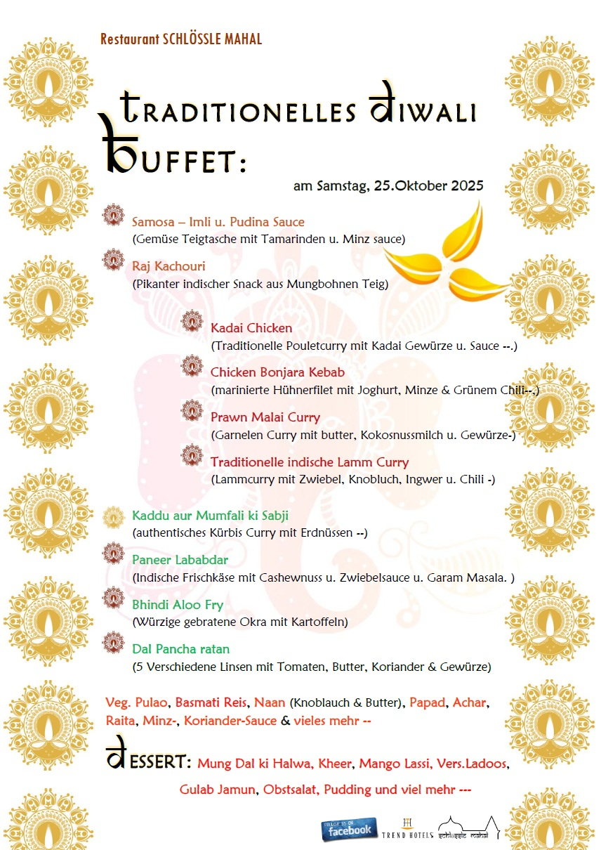 W Wir bieten traditionelle, authentische Nord und Nord-Ost indische Hausmannkost für unsere regionalen und internationalen Gäste mit vegetarischen und nicht-vegetarischen Gerichten im Buffet und à la Carte Angebot. Das Mittagsbuffet und das Familienbuffet am Freitag- und Samstagabend ist sehr beliebt bei unseren Gästen. In Indien werden für eine Mahlzeit sehr viele verschiedene Gerichte zubereitet, gegessen und auch immer nebenbei gekocht. Deswegen ist ein Buffet die ideale Art indische traditionelle Küche zu probieren. Bei uns ist die gute Qualität des Essens oberste Priorität, weshalb wir ausschließlich frische Zutaten selbst einkaufen und für unsere Gerichte benutzen. Im Schlössle Mahal muss Indisch nicht immer scharf sein, da Sie den Schärfegrad bei Ihrer Bestellung entscheiden. Das Essen wird erst nach der Bestellung zubereitet und auf speziellen Wunsch auch gerne besonders scharf gewürzt.